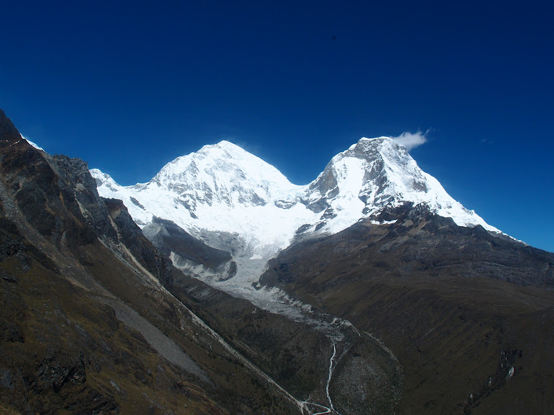 I expected a long and boring busride home. NOT so. We actually managed to climb even higher, passing right beside scores of 6,000 meter peaks, including Mt. Huascaran, the highest in Peru. The bus stopped at the highest point so we could jump out and take pictures. Above, the Cordillera Blanca lined the horizon. Below, a squiggly white line zigzagged haphazardly down the nearby vertical cliff. What is that? Some insane river? Oh mother of God it’s the road. We actually have to drive on that.